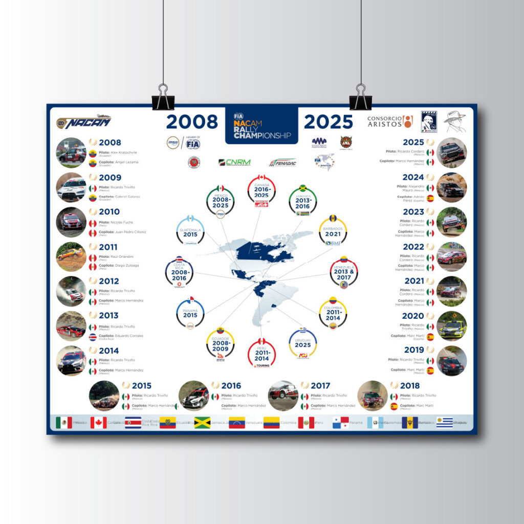Este póster conmemorativo recorre los momentos clave del campeonato a lo largo de más de una década, celebrando sedes, equipos, pilotos y copilotos que han llevado el rally NACAM por Norte, Centro y Sudamérica.
